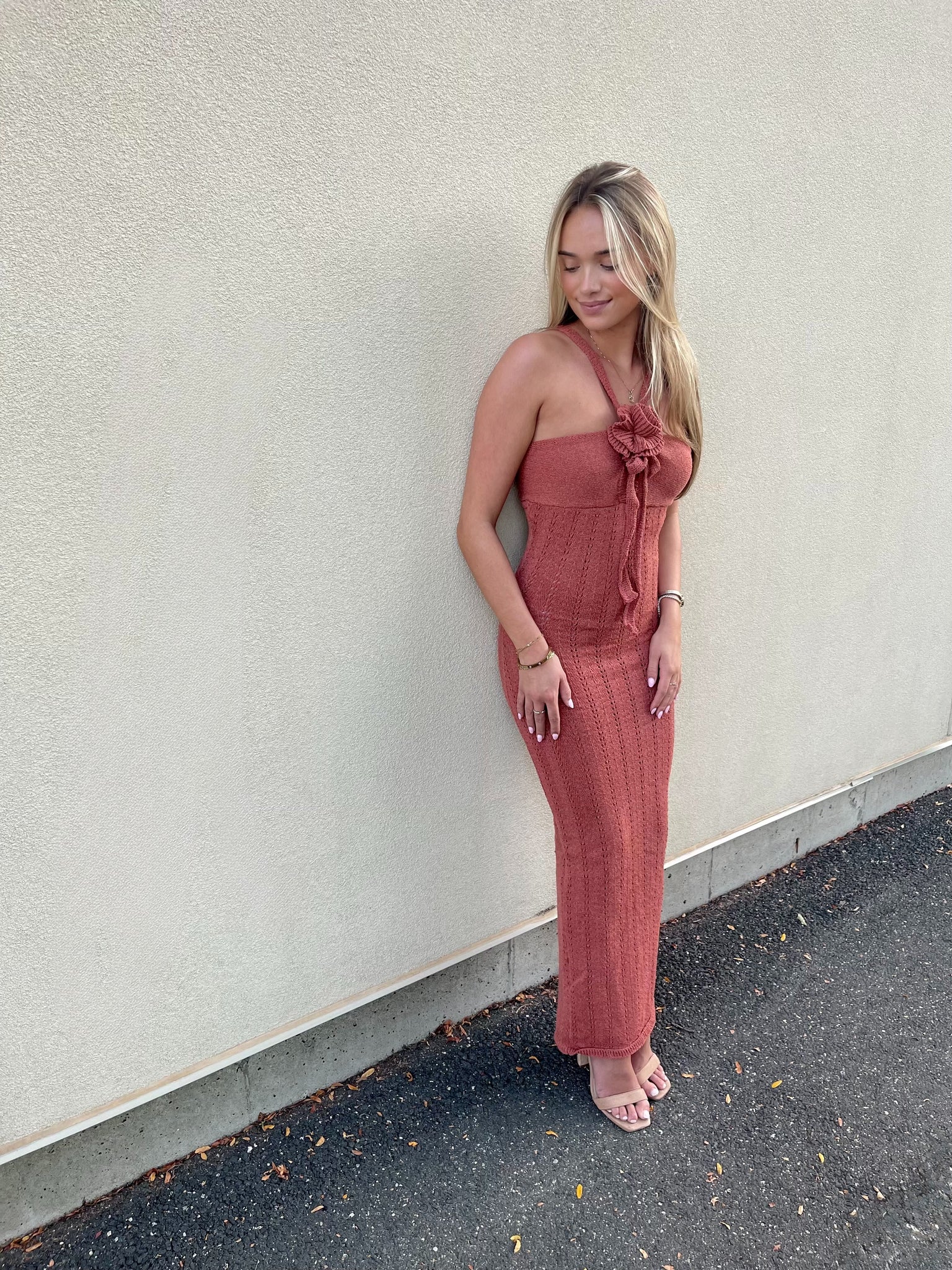 Rust crochet maxi dress with rose accent. Adjustable straps and low back. Runs true to size